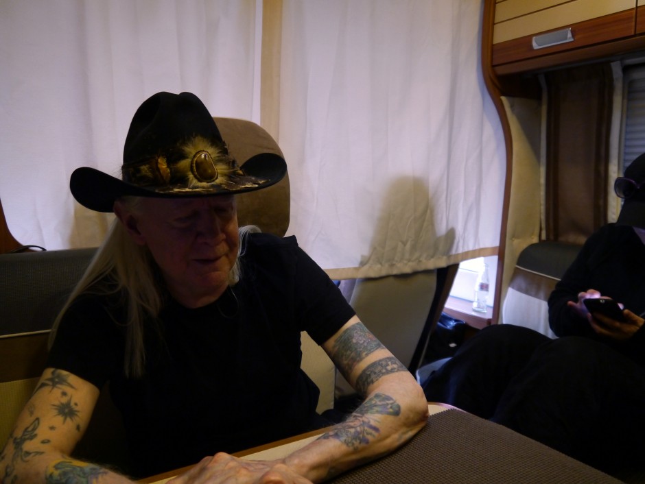 <p style="text-align: justify;">Was am 27. Februar 2013 aus einer Laune heraus zwischen mir und Raimund Nitzsche begann, wurde am 9. April 2013 zur Wirklichkeit. Es ergab sich die einmalige Gelegenheit, Johnny Winter und Teile seiner Band vor dem Auftritt zu interviewen. Johnny Winter tourt wie immer in einem eigenen Tourbus, in welchen er auch gelegentlich Fans empfängt und Interviews gibt. Bevor wir zum Gespräch mit Johnny kamen, unterhielt ich mich <b>mit</b> seinem Bandmanager Paul Nelson über die gestiegene Popularität von Johnny Winter. Paul sprach von sehr gezielten Marketing Aktivitäten, die Johnny Winter z.B. auf Facebook in kurzer Zeit 86000 „Gefällt mir“ bescherten. Das vermehrte Posten von Videos und Bildern in den sozialen Netzwerken lockt auch mittlerweile die jüngere Generation in seine Konzerte. Gleichzeitig verdoppelte sich die Konzertbesucherzahl. Paul Nelson führt das auch auf Johnnys neue Offenheit zurück, ausführliche Interviews zu geben oder sich auch bei David Letterman zu präsentieren. Die Idee, mit einer „Roots“-CD sowohl die musikalische Wurzeln zu zeigen wie auch musikalische Freunde zu den Aufnahmen einzuladen, wurde bei Paul Nelson geboren. Leider lies<b>s</b> Johnny sich bei den Aufnahmen so viel Zeit, dass andere mit dieser Roots-Idee schneller und erfolgreicher auf den Markt kamen. Zum Interview fanden wir einen blendend gelaunten Johnny Winter vor, der uns herzlich im Bus willkommen hieß. Johnny macht, was auch durch Paul bestätigt wurde, einen hervorragenden körperlichen Eindruck. Bei dem 2 Tage zuvor stattgefundenen Konzert im Pariser Olympia spielte Johnny Winter 2 Songs im Stehen. Auch hier freute sich Paul Nelson, dass Johnny Co-Musiker wie seinen Bruder Edgar Winter und auch Robben Ford auf der Bühne begrüßte.</p>