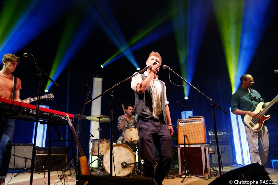 <p style="text-align: justify;">Das Zelt füllt sich langsam und ich würde sagen, dass es fast ausverkauft war. Unter lauten Applaus kamen nun Jesper Munk und seine Band auf die Bühne. Das ist Louis von Stebut an der 2. Gitarre und dem Keyboard, Schlagzeuger Clemens Finck von Finckenstein und zu meinem Erstaunen nicht Rainer Germann sondern Sasseh Söllner Bobo am Bass. Das Intro kam gleich gewaltig – ich liebe es, wenn das Intro nur über ein oder zwei Akkorde geht, leicht improvisiert wird und Druck aufgebaut wird. Dann startet Jesper mit einigen unbekannteren Nummern. Das Publikum ist und bleibt begeistert. Von den Damen und Herren meist über 30 höre ich immer nur einen Satz: Der ist phantastisch! Mit weit weniger Soundeffekten als auf der CD „Claim“ und mit Louis von Stebut am Keyboard klingen die Songs einfacher und noch ehrlicher. Aber wie auch auf der CD gefallen mir die swingenden Nummern besser als die Stücke mit der überzeichneten Stimme von Jesper Munk.</p>