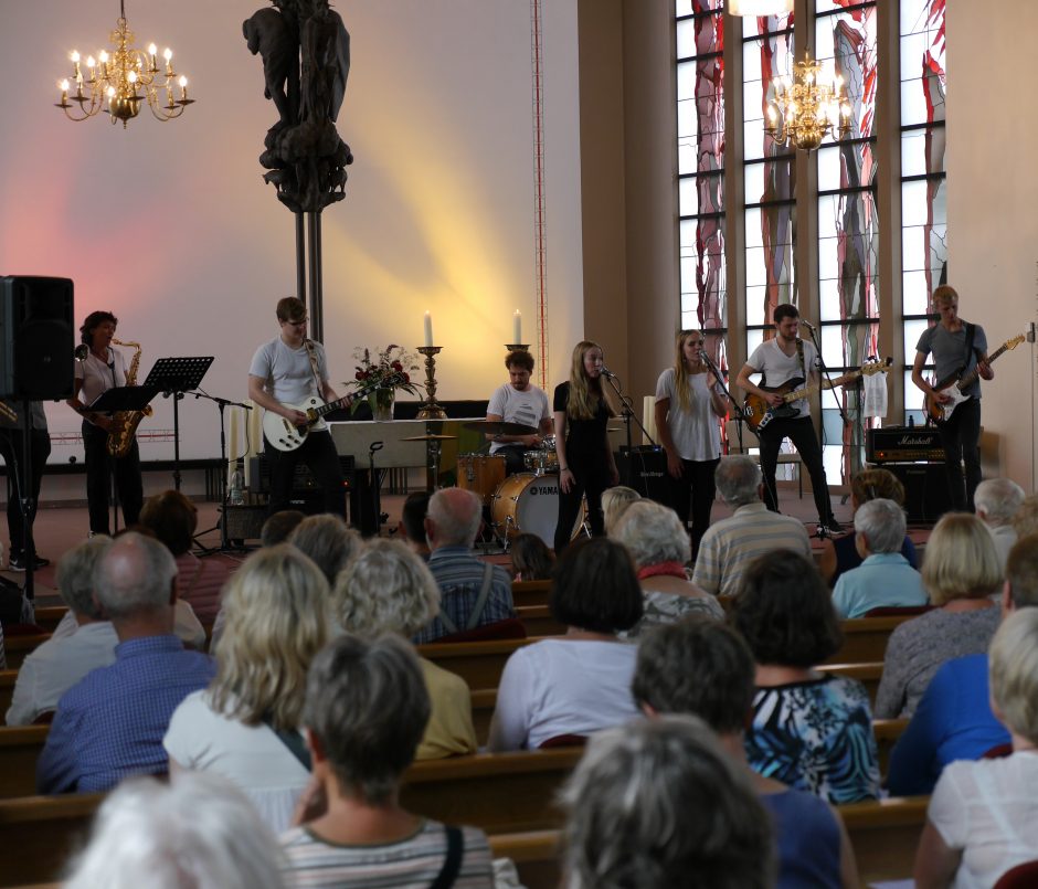 <p style="text-align: justify;">Über die gesamte Breite des Altarraumes stand die Band verteilt. Diesen Platz brauchten aber auch die neun Musikerinnen und Musiker. Oh Lord I Got The Blues ist im Rahmen des Popkonzepts der Ev.-Luth. Kirche in Oldenburg entstanden, das ein popularkirchenmusikalisches Profil entwickelt. Die Band wurde vom Oldenburger Popkantor Steffen Schöps 2016 gegründet. Im Programmheft findet sich der entscheidende Satz: „ Der Blues kennt kein Alter. Junge Talente und alte Hasen tauchen zusammen tief ab zu den Wurzeln des Blues, um diese wahnsinnig vielfältige Musikrichtung bis zu den Neuerscheinungen der letzten Jahre zu erforschen.“ Und da stehen junge Talente. Mit viel Verve hat Steffen Schöps, der in Osnabrück u.a. bei Toscho Todorovic studiert hat, ; innerhalb eines Jahres eine Band zusammengestellt, die wunderbar aufeinander eingespielt wirkt. Er selbst am Bass und Jente Tabeling am Schlagzeug legen ein sicheres Rhythmusfundament, auf dem sich die Gitarrensolisten Lennart Reuß und Hendrik Ohlhoff an der weißen Les Paul schön entfalten konnten. Herausragendes Klangmerkmal der Band ist aber der satte Bläsersatz (Renate Dirks – Saxophon, Karen Erichsen – Posaune, Lars Varchmin- Trompete)  ;mit gut gesetzten Harmonien und ganz besonders eben die beiden Sängerinnen Lilly Tauch und Julia Walter, wunderbar auf dem Punkt, schön phrasierend und engelgleich-glockenklar, weniger whiskey-rauchschwanger-getränkt. Der Autor dieser Zeilen und das Publikum waren gleichermaßen begeistert.</p>